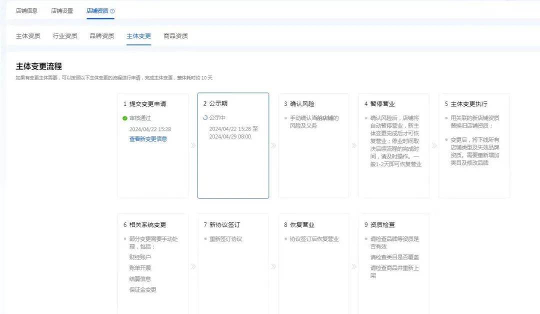 2.提交变更申请(目前还没有完全开放变更入口,建议寻找靠谱行业小二,进行店铺变更)。