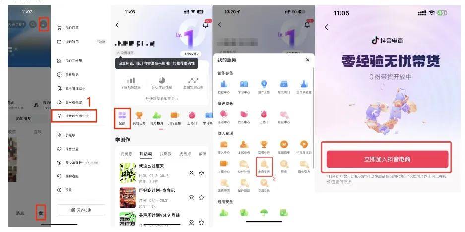 1.打开抖音APP,“我”-右上角“...”-“抖音创作者中心”-“电商带货”。